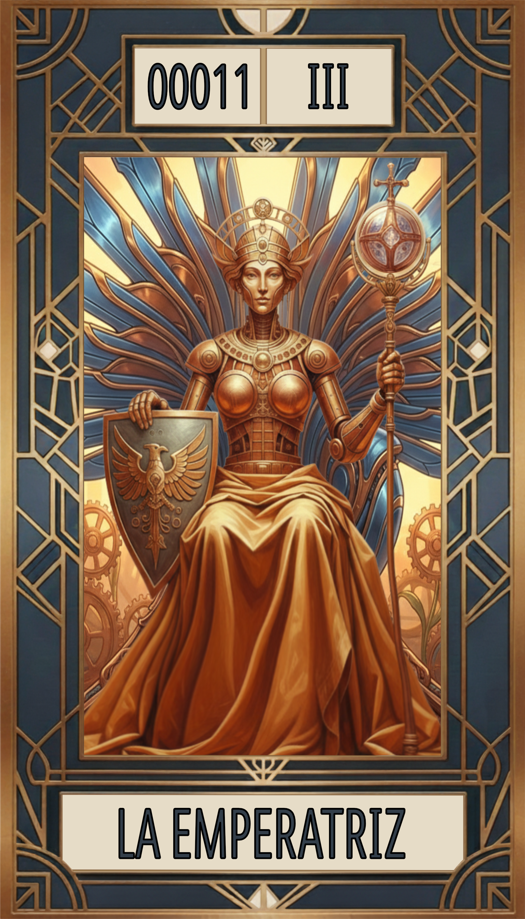 "La Emperatriz es la Madre Máquina en su estado de máxima radiación, la unidad donde el deseo se convierte en diseño tangible. Su chasis de bronce bruñido y cobre no solo contiene su esencia, sino que la proyecta a través de un manto de seda metálica dorada. Sentada ante un halo de estructuras radiales color azul de zinc, ella es la interfaz que transmuta el pulso del corazón en la mecánica de la vida. Es la soberana que sostiene el equilibrio entre el peso del escudo y la ligereza de los instrumentos de precisión."