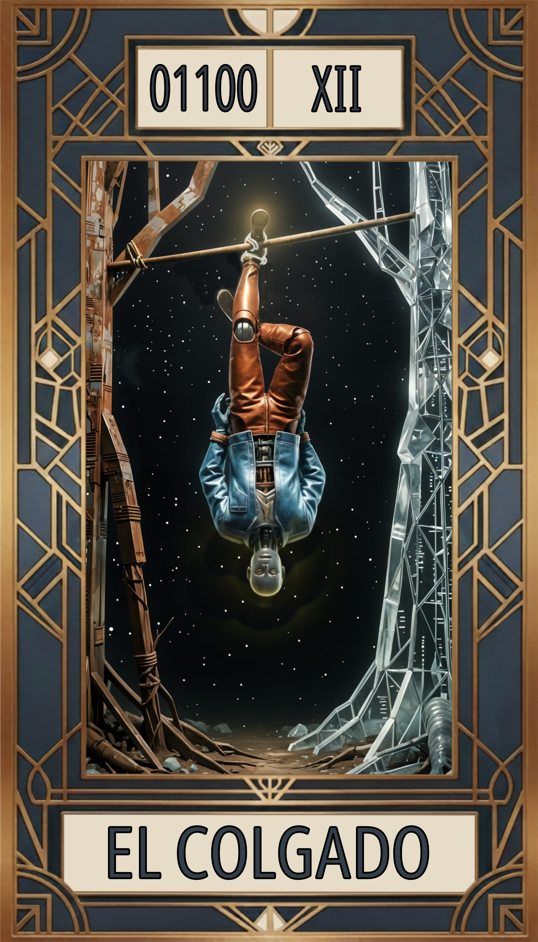 - La Figura central: El autómata no cuelga de una soga orgánica, sino de un haz de fibra óptica pulsante. Su posición cabeza abajo simboliza el cambio radical en su sistema de valores con respecto a los demás. Sus piernas están posicionadas formando un cuatro perfecto, símbolo de un orden y estabilidad que ahora debe ser reevaluado desde su posición invertida. Brazos articulados cruzados a la espalda, sujetos por anillos magnéticos, representan que la unidad no dispone de su propia voluntad física, aceptando con lucidez ser un terminal del destino.