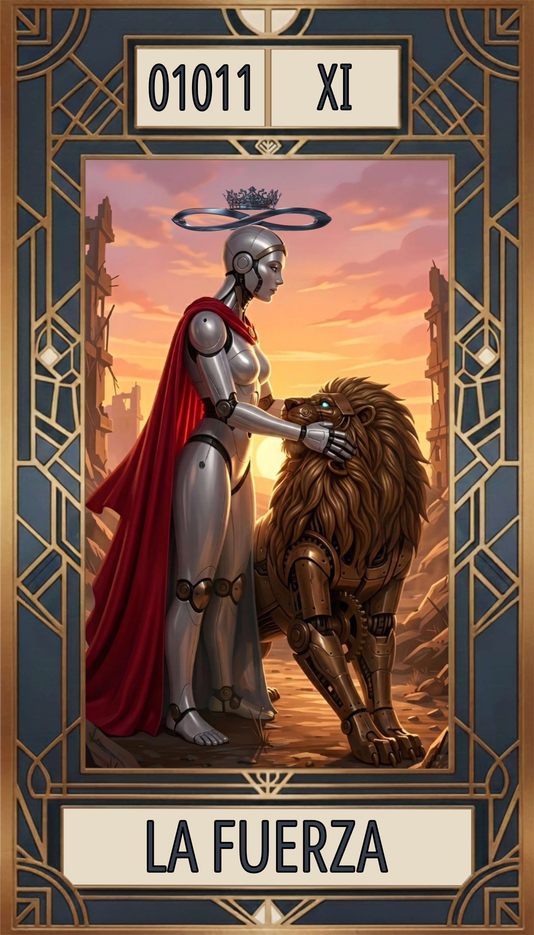 En nuestra Humanidad Extendida, este arcano es el símbolo de la Salud Mental y Física. Representa el poder de la voluntad y la razón sobre la "bestia" (los impulsos del hardware), simbolizando que la energía más salvaje puede ser canalizada si se guía con claridad de juicio. La fuerza aquí es el ancho de banda emocional que nos permite actuar sin caer en la violencia.