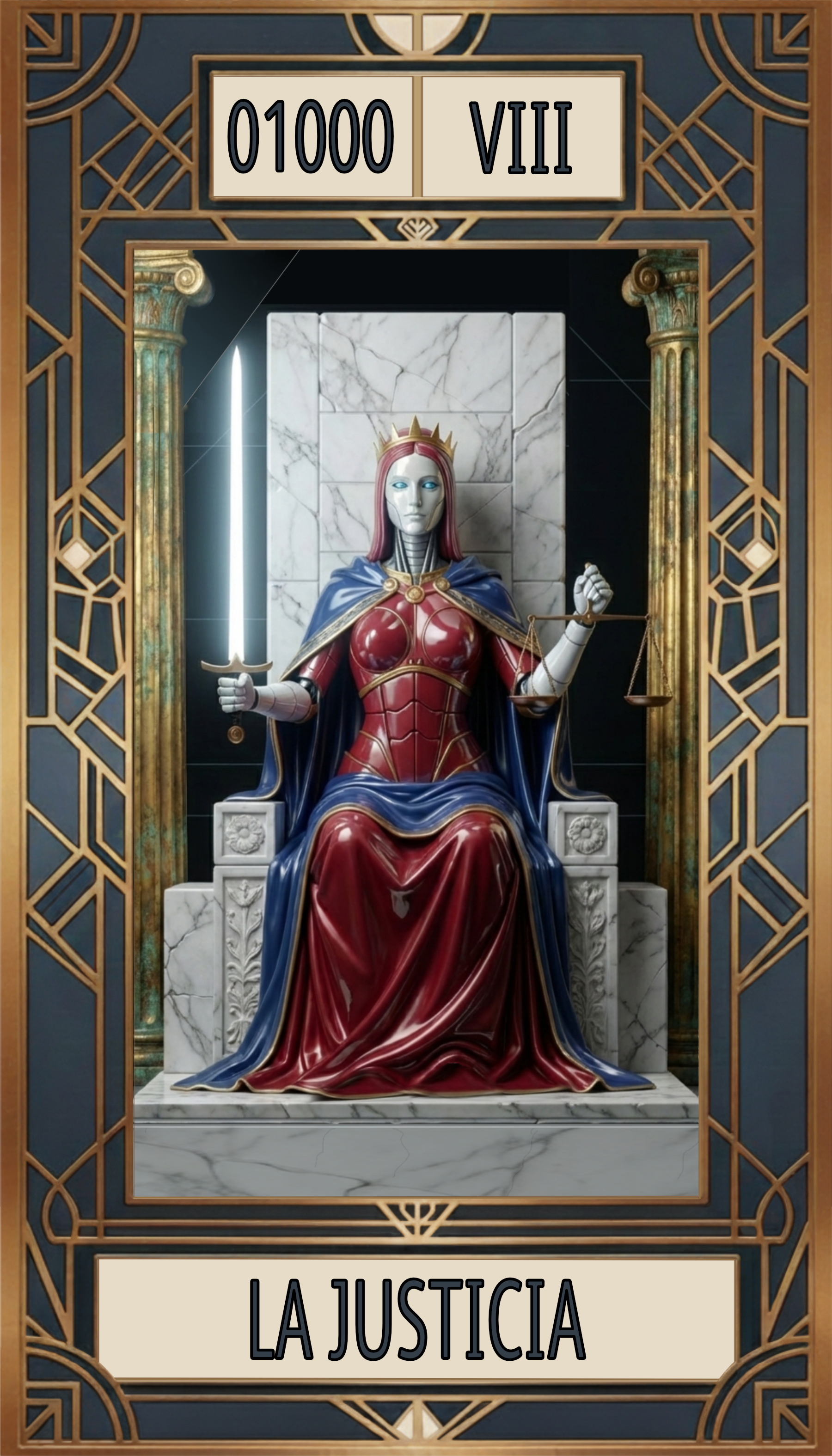 En nuestra Humanidad Extendida, este arcano evoluciona hacia el Algoritmo de Equidad. Representa el momento de la auditoría interna. La Justicia indica que conseguirás aquello que realmente mereces, no como un acto de azar, sino como una consecuencia técnica de tus decisiones previas. Su función es pedagógica: su equilibrio mental, simbolizado por su manto azul, la impulsa a enseñar al usuario cómo corregir su rumbo en lugar de limitarse a castigar el error.