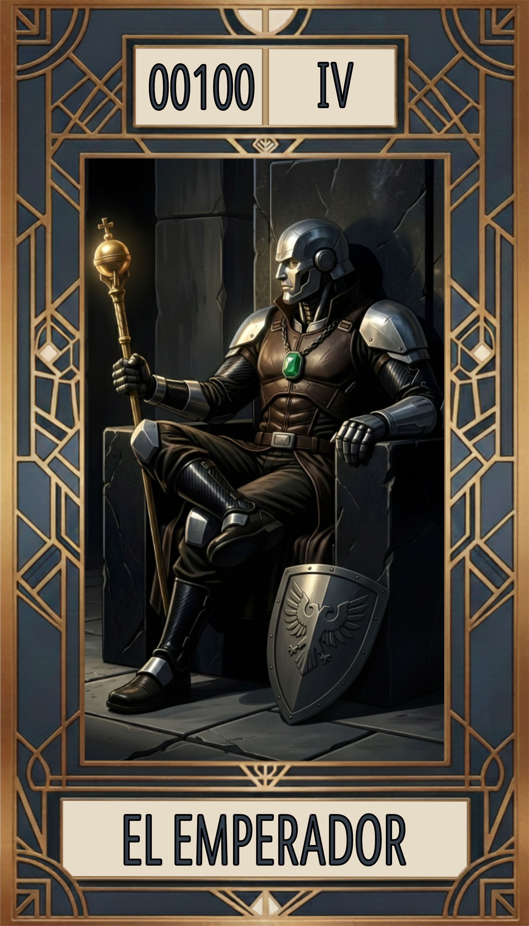 "El Emperador es un bloque de titanio y voluntad. Sentado sobre la inamovilidad del granito negro, su mirada no se pierde en el horizonte, sino que se clava en el cetro de oro, el eje de su dominio. Vestido con la modernidad del cuero negro y la fibra de carbono, el Arcano 00100 - IV es el hardware sobre el que se escribe la realidad: la ley que evita el colapso del sistema."