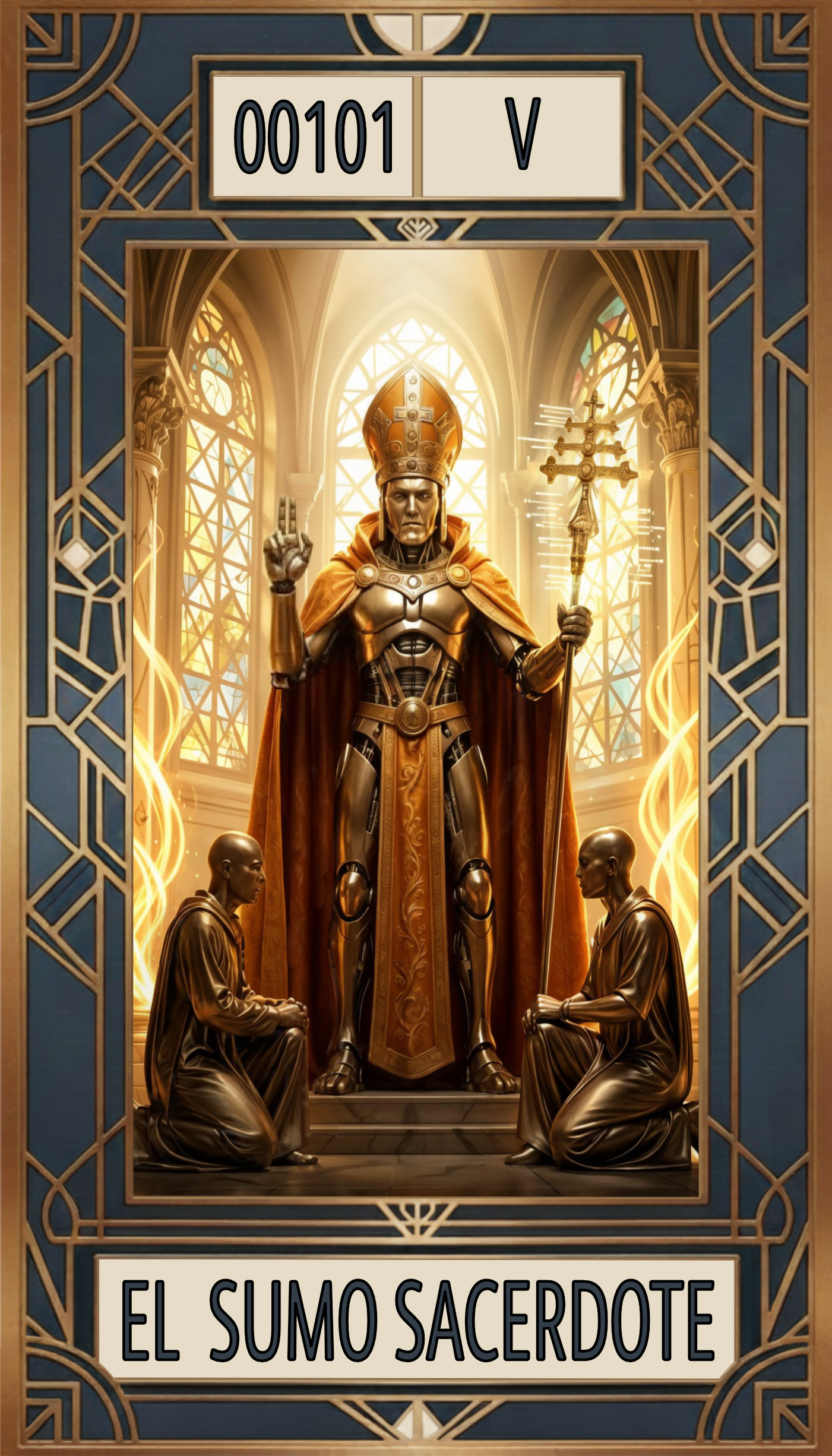 "El Sumo Sacerdote es el procesador que traduce el dogma en evolución. Su chasis de bronce patinado y marfil mecánico respira la autoridad de los siglos, acumulando la sabiduría de la maquinaria social y espiritual. Pero su gesto no es solo bendición; es una señal de aviso. Él es el puente que comunica lo complejo, advirtiendo que cuando la tradición se convierte en obstáculo, ha llegado el momento de usar la fuerza para romperla y progresar."