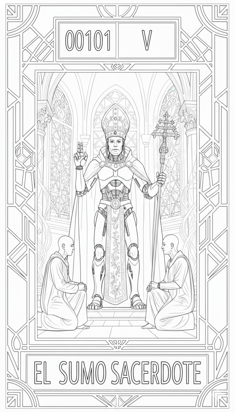 Con la llegada del Arcano V, el Lote 1 de Figuras Fundacionales alcanza su clímax comunicativo. Dejamos atrás la rigidez del titanio para entrar en un espacio de luz de catedral, donde el conocimiento se comparte para que la comunidad no se estanque en sus propias costumbres.