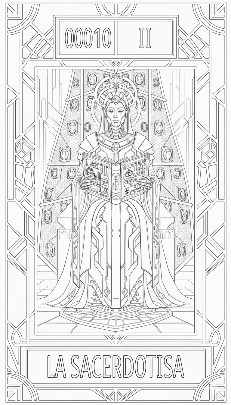 En este Tratado Visual, el Arcano II es una figura estática, pero no pasiva; es la Guardiana del Enigma. Representa la base de datos oculta, el conocimiento que no necesita ser gritado para existir. Es la arquitectura que sostiene la realidad antes de que cualquier bit sea ejecutado.